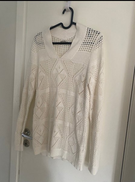 En vit stickad tröja med långa ärmar och V-ringning. Tröjan har ett genombrutet mönster som skapar en luftig och detaljerad design. Muddar finns vid ärmslut och nederkant.