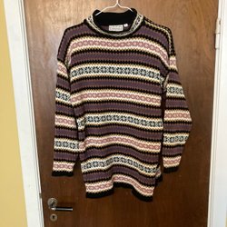 Tröja med mönster i olika färger. Tröjan har en hög krage med knappar framtill. Det finns två fickor i sidorna som leder till en magficka. Tröjan har långa ärmar.