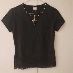 Tröja med halv hög krage och långa ärmar. Tröjan har ett dekorativt mönster med horisontella ränder och pärldetaljer på framsidan. En blomformad applikation pryder också framsidan.