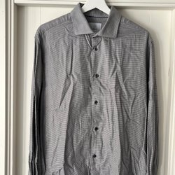 Grön och mörkblå skjorta med långa ärmar och en bröstficka. Skjortan har en klassisk krage och knäppning fram.