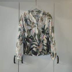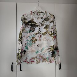 Ljus blus med ett blommigt mönster i lila och gröna toner. Blusen har långa ärmar och en klassisk krage. Den har en avslappnad passform och en något rundad nederkant.