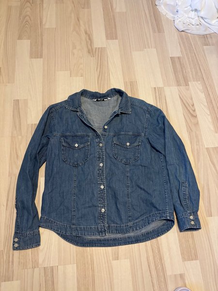 Skjorta i denim med långa ärmar, krage och knäppning framtill. Den har två bröstfickor med knappar och en rundad nederkant.