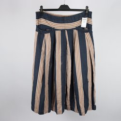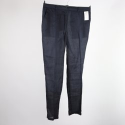 Ett par utsvängda byxor i en mörkare nyans. Byxorna har en hög midja och en smal passform över låren som sedan gradvis vidgas nedåt. Storlek 38, true size