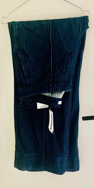 mörkblå byxor ,randig textur vida med sneda fickor fram,