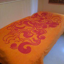 Blå batikmönstrad kaftan med korta ärmar och 1 ficka. Kaftanen har ett unikt mönster som påminner om moln eller vatten, med inslag av ljusare och mörkare blå nyanser. Den har en öppen design framtill och en lös passform. På baksidan finns en dekorativ applikation i form av en stiliserad trollslända eller blomma i mörkare toner med broderade detaljer och en mindre på vänster axel. 100% bomull förutom bandet runt öppningen som antagligen är polyester.