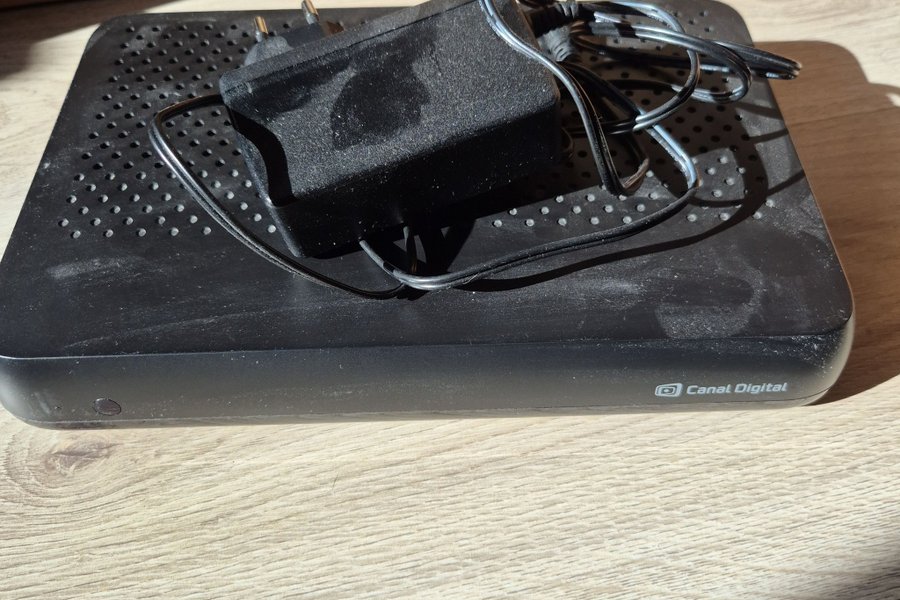 Digitalbox från Canal Digital. Enheten är svart och har en perforerad ovansida. Strömadapter medföljer.