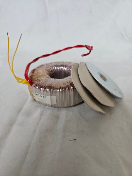 En transformatorer från Transduktor AB, modell 6010. Varje transformator har flera färgkodade ledningar för anslutning. Till varje transformator medföljer metallrondell samt två neoprenskivor. Metallrondellen är ett utmärkt tillbehör för montering av transformatorn. Fördjupningen i metallrondellen är för centrumbult för fastsättningen. Stjäl inte någon bygghöjd.