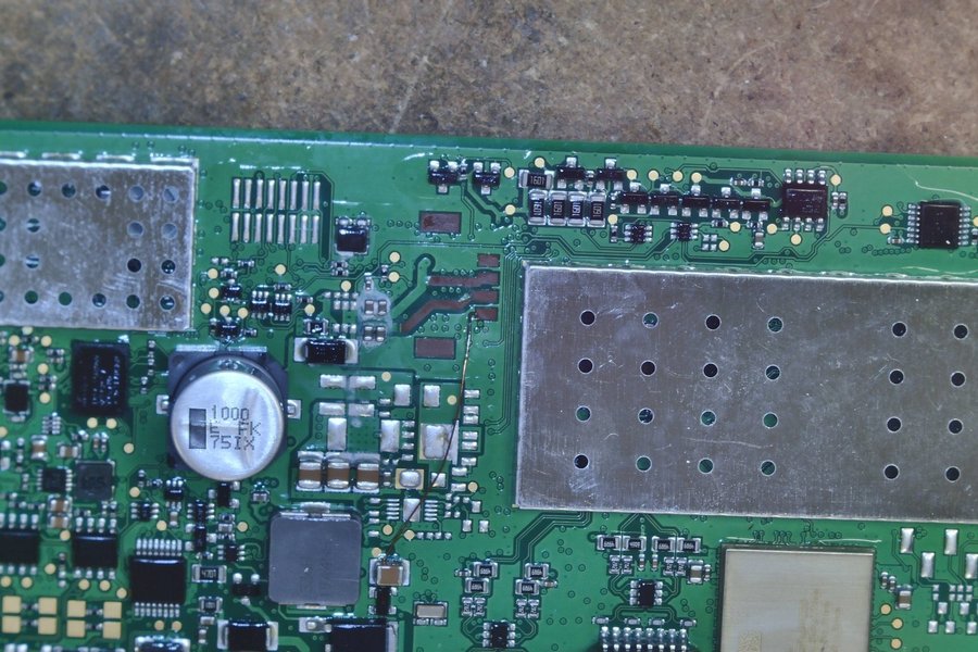 Kretskort med diverse komponenter. Inkluderar kondensator märkt "1000 EFK 751X" och flera resistorer märkta "1601" och "606h". Även processor SLGJ4 och SLGZC.