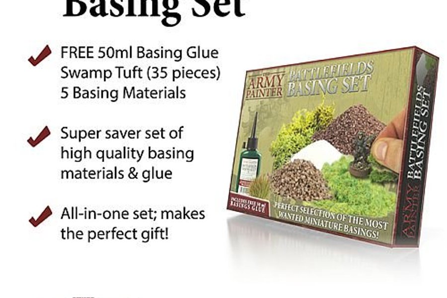 This amazing set has been designed to give the wargamer a “one box fits all” for you miniature bases. Includes all the basic basing materials you need to make any base for your miniatures. It also includes a free 50ml Battlefields Basing Glue as well as the Army Painter Technique Painting Guide.