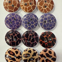Ett set med åtta dekorativa träknappar. Varje knapp har ett unikt och färgglatt mönster, vilket gör dem perfekta för att lägga till en personlig touch till dina sömnadsprojekt.