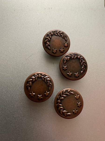 Fyra runda knappar i en mörkare metallfärg. Varje knapp har en dekorativ krans runt kanten och tre stjärnor placerade nedanför kransen. Av metall. 15mm.