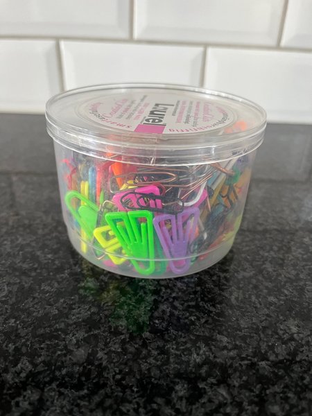 En burk med gem, mestadels plast men finns även ett gäng i metall i, ej räknade. Endast ett fåtal använda.