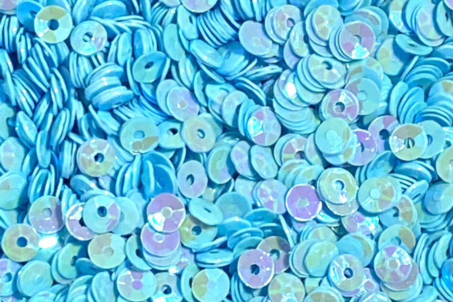 Paljetter små lätt böjda kanter ljusblå med skimrande toner av lila 3mm stora