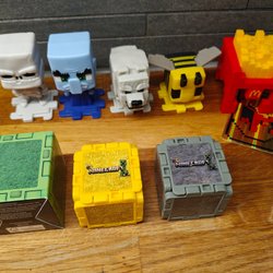 En låda med två mindra bilar och passagerare och sen tre mindre sett med figurer mest i plus något tillbehör och sist en tomte figur.