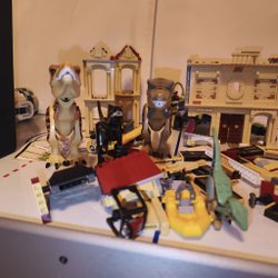 Lego set med olika teman och figurer. Inkluderar en luftballong och olika landskap.