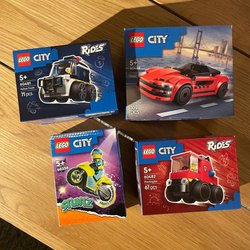 LEGO polisbil i mörkblått med vita detaljer och röda/blåa lampor. Instruktionsbok medföljer.