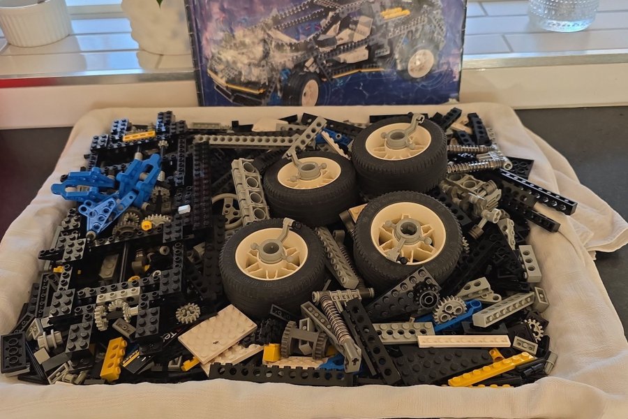 Lego Technic set 8880 med tillhörande kartong. Innehåller en mängd legobitar och hjul.