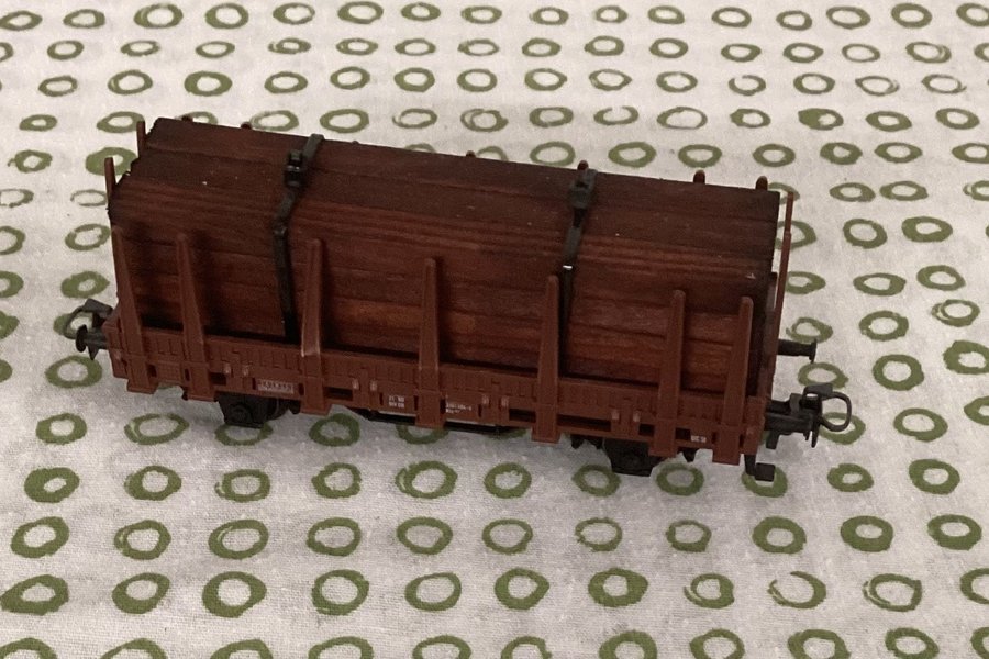 Modelljärnväg godsvagn. Vagnen är en stolpvagn med brun färg. Den är lastad med timmer. Märkt med 'DB' och nummer '281 464-0', vagnen är i mycket fint skick, alla stolpar är hela,