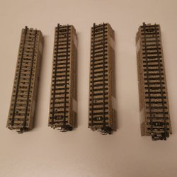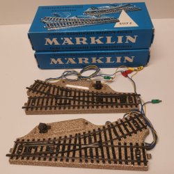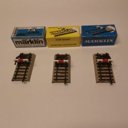 Ett set med Märklin tågspår. Inkluderar raka spår, böjda spår och stoppbockar.