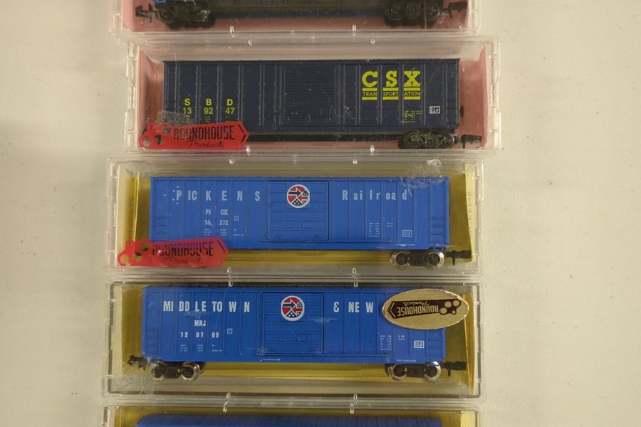 Fem st boxcars säljes, troligtvis från Roundhouse Models men några av askarna matchar inte vagnen.