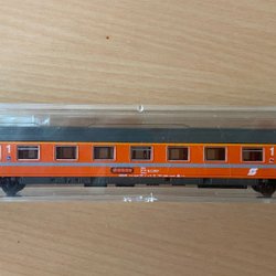 Fleischmann 8233 modelljärnvägsvagn med två Alcro-containrar. Vagnen är i N-skala.