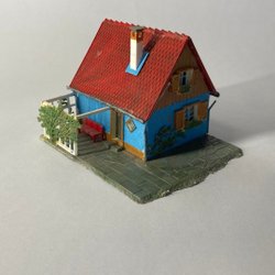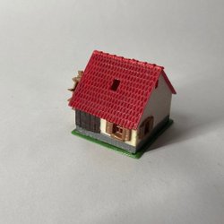 En charmig modellbyggnad med ett distinkt svart tak. Perfekt för modelljärnvägar eller som en dekorativ detalj i ett diorama. Lite målarfärg nertill samt sprucken botten.