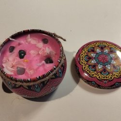 Överraska dig själv eller en vän med detta handgjorda doftljus av sojavax som gömmer en slumpmässigt vald typ av kristallsten.