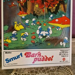 Ett träpussel med motiv av Smurfarna.