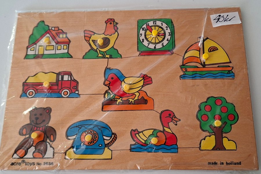 Träpussel med nio olika motiv, inklusive ett hus, en höna, en klocka, en båt, en lastbil, två fåglar, en nallebjörn, en telefon, en anka och ett träd. Pusslet är märkt "acre® toys No. 2636" och "made in holland".