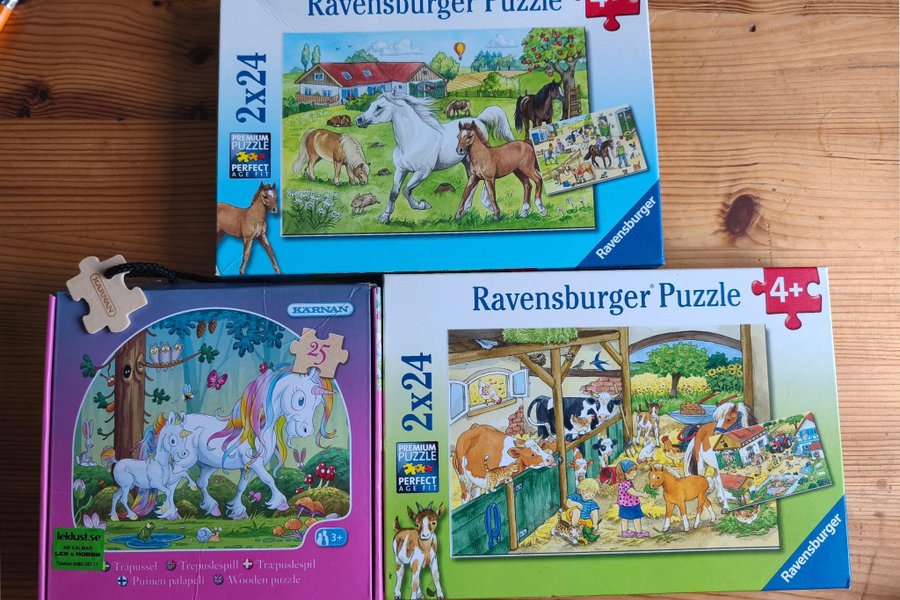 Fem pussel för barn. Två pussel från Ravensburger med 2x24 bitar vardera. Ett pussel från Karnan med 25 bitar.