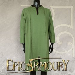 The Ready-For-Battle Tunic is a classic thigh-long medieval tunic. The tunic reaches from the shoulders to under the waist and has a round neck making the garment easy to don. The sleeves are elbow-long and the tunic is lined along the neck, at end of the sleeves and along the hem. The material is light and soft, black cotton. The Ready-For-Battle Tunic is a classic cut and can be worn either as a costume piece on its own or form the basis for several different style of richer, layered costumes worn on top of it. The style is moderate and can be used on a broad variety of characters. It is also fully compatible with Epic Armoury's leather and steel armours giving the player total freedom to create a personal style.