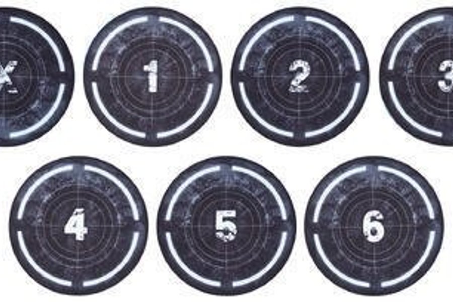 Rubber based (mousepad) Objective markers (numbered 1 to 6 and X) with 40mm base marked + 3 inch scoring area and marked middle point. With highly detailed printed design.