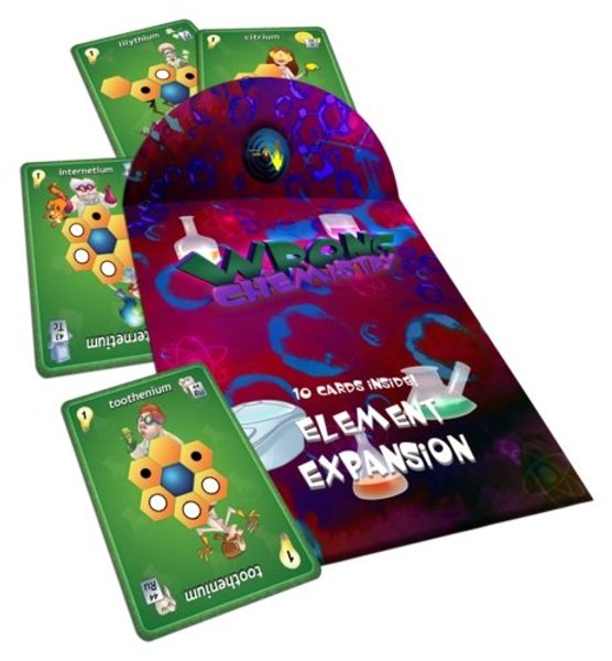 Wrong Chemistry: Element Expansion includes ten cards that feature periodic table elements not included in the base Wrong Chemistry game. Mix these cards with the Elements of the Basic game in order to create a wide range of cards which will offer you more choices on how to form more molecules in the same turn!