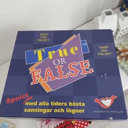 Säljer ett sällskapsspel True or False. Spelet innehåller spelplan, spelregler, 6 flytt-tabeller, tärning, kortlåda med 1144 påståenden, 12 svarskort, 2 kort som visar från vilka tidsperioder spelets påståenden är hämtade.