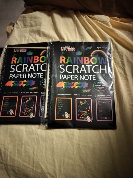 Två stycken Rainbow Scratch Paper Note. Varje anteckningsblock innehåller 10 skraplotter och en träpenna. Lämplig för åldrarna 3+.