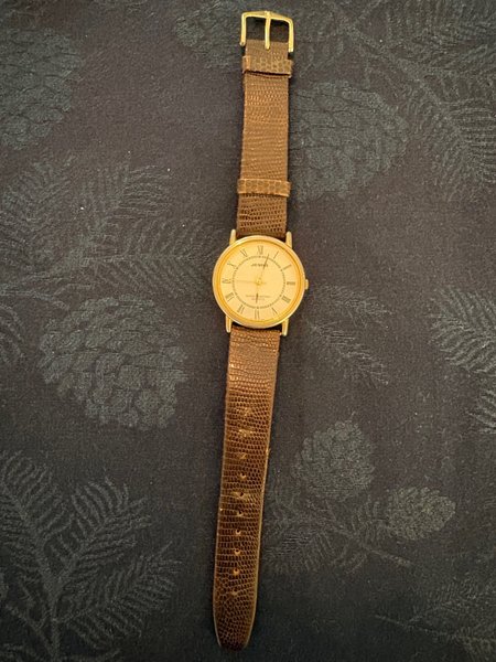 Jemis armbandsur med en guldfarvet urkasse og en brun rem. Uret er vandafvisende og har quartz urværk.