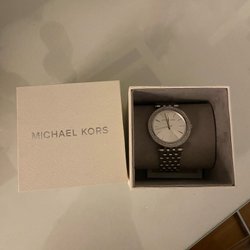 Säljer en Michael Kors damklocka. Klockan har en silverfärgad boett med en vit urtavla och romerska siffror. Urtavlan är omgiven av stenar. Armbandet är tillverkat av rostfritt stål.