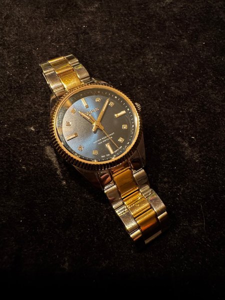 Elegant Morris damklocka med en tvåfärgad länk i guld och silver. Urtavlan är blå med dekorativa detaljer. Klockan är märkt som vattentålig till 100 meter. Tyvärr enbart klocka inga extra länkar. Liten i storleken