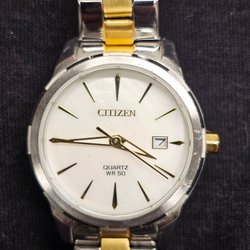Citizen damklocka i stål och gulddetaljer. Klockan har en vit urtavla med datumvisning. Vattenskyddad WR 50. Boetten är tillverkad i rostfritt stål. Armbandet är tillverkat i stål med gulddetaljer.