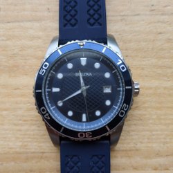 Bulova "Curved" herrklocka med stålarmband. Klockan har en blå urtavla med tre mindre urtavlor och en röd sekundvisare. Baksidan av klockan är märkt med "Bulova, Ultra High Frequency, Sapphire Glass, Water Resistant, B6 ST Steel".