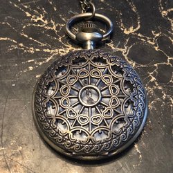 Halsbandsklocka med en fyrkantig urtavla och silverfärgad kedja. Klockan har en vit urtavla med svarta markeringar och visare. Skyddsplast på uret ej borttagen. Behöver nytt batteri.