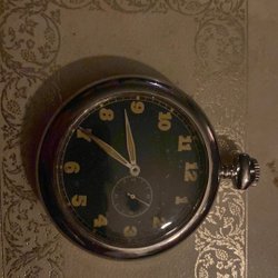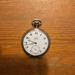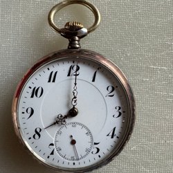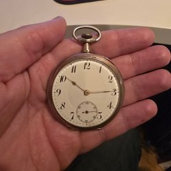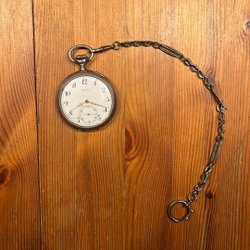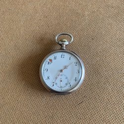 Antikt fickur med vit urtavla och romerska siffror. Urtavlan är märkt med 'ANTIMAGNETIC'. Baksidan av boetten är dekorerad med ett mönster.