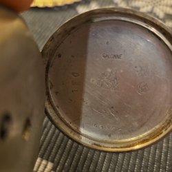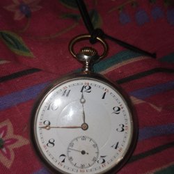 Antikt fickur med vit urtavla och romerska siffror. Urtavlan är märkt med 'ANTIMAGNETIC'. Baksidan av boetten är dekorerad med ett mönster.