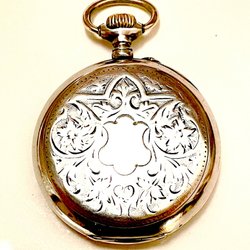 Ett vackert fickur i silver. Uret har en detaljerad urtavla med svarta siffror och en separat sekundvisare. Baksidan av uret är dekorerad med ett graverat mönster och en sköld. Urverket är mekaniskt och har 15 rubiner. Märkningar finns på insidan av boetten.