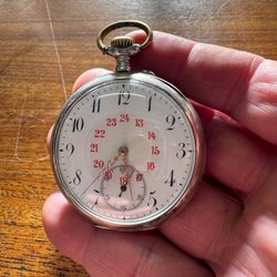 Ett fickur i silver. Uret är märkt "Cylindre 8 rubis" inuti boetten. Boetten är stämplad med "800" och serienummer "546886". Uret väger 73 gram.
