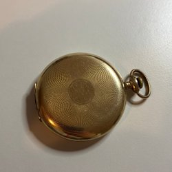 Klassiskt fickur med dekorativ urtavla och detaljerad baksida. Uret har romerska siffror och blå visare.