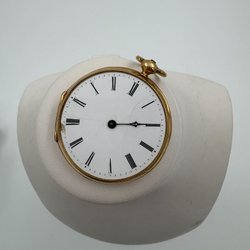 Ett fickur med en vit urtavla och svarta siffror. Urtavlan har en liten sekundvisare. Boetten är dekorerad med ett mönster och en sköld. Urverket är mekaniskt och märkt med "G.T". Inuti boetten finns stämplar, inklusive "0.800" och en krona.