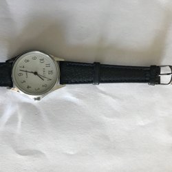 Facit barn. Diam 20/22mm. Vit tavla med svarta siffror och minutmarkeringar. Silverfärgade visare. Rosa läderband. Klockan är oanvänd men har några små ytliga märken då den legat ihop med andra klockor