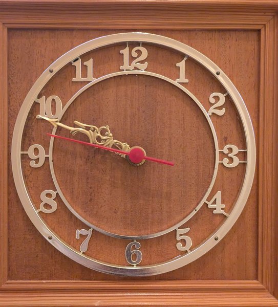 En klassisk väggklocka med träbakgrund och guldfärgade detaljer. Tydliga siffror gör den lätt att läsa.