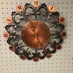 En väggklocka av märket Junghans. Klockan har en dekorativ design med detaljer i guld och trä. Pendel och nyckel ingår.